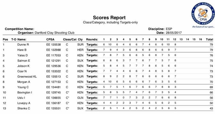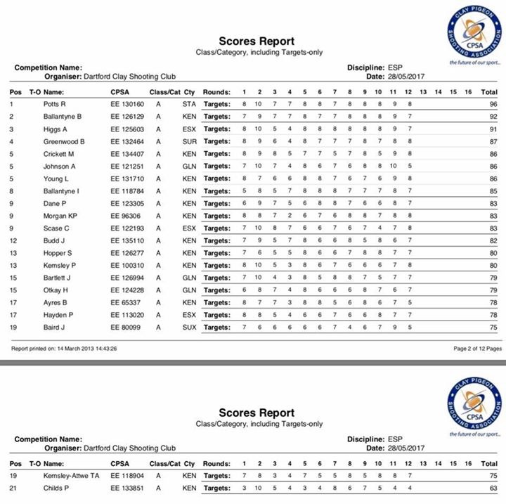 Full list of scores will follow.