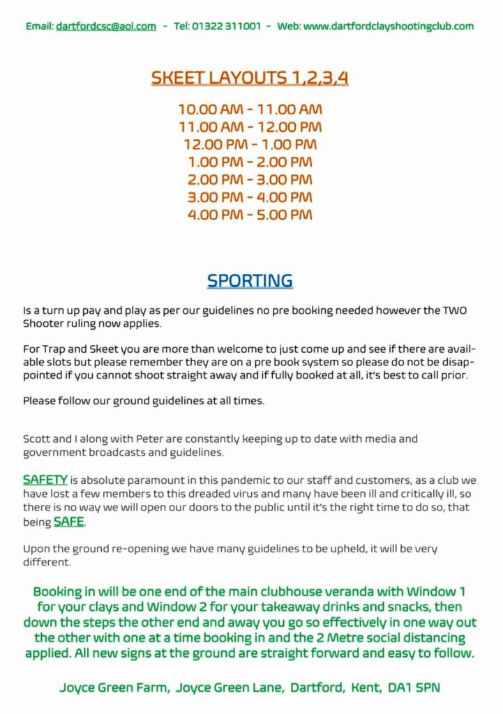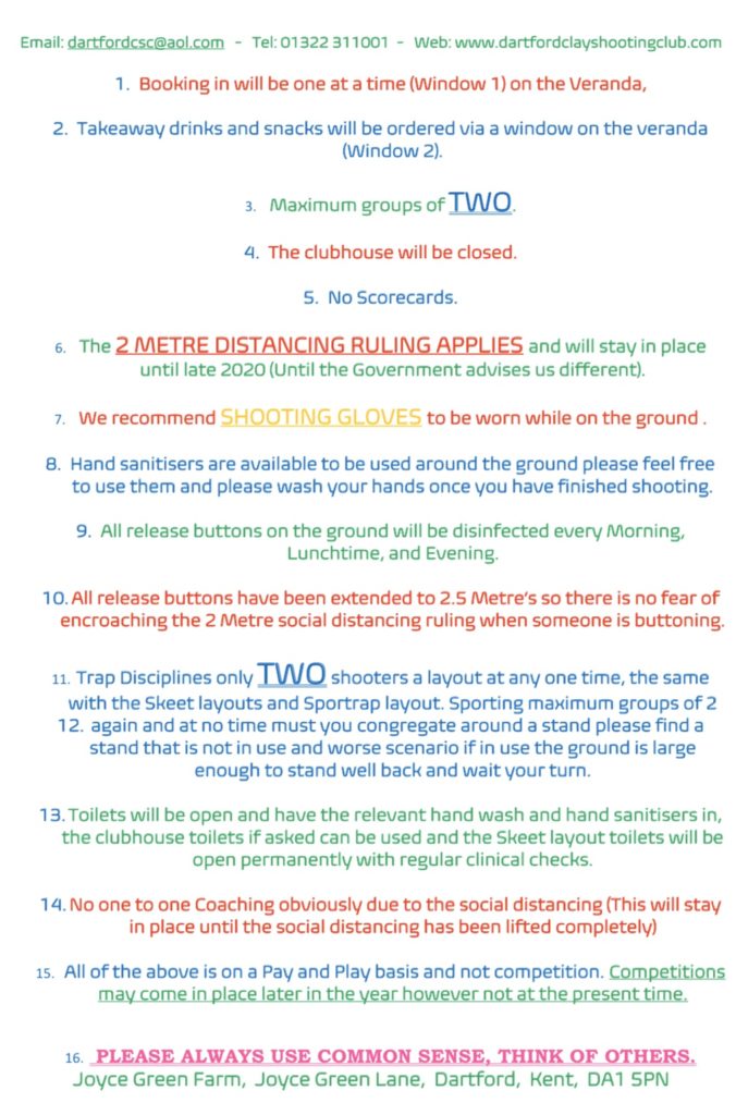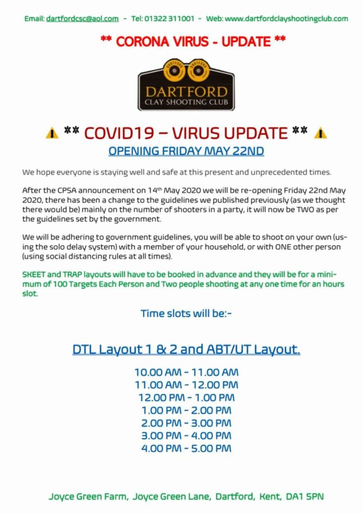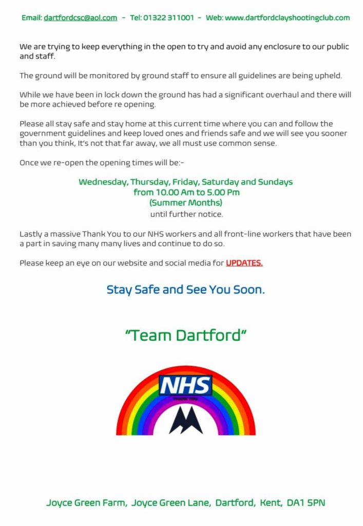 DARTFORD CLAY SHOOTING RE-OPENING FRIDAY 22ND MAY 2020